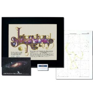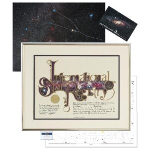 - Includes a personalized 12″ X 16″ star chart customized with the star name and dedication date. The location of the star is circled in red.